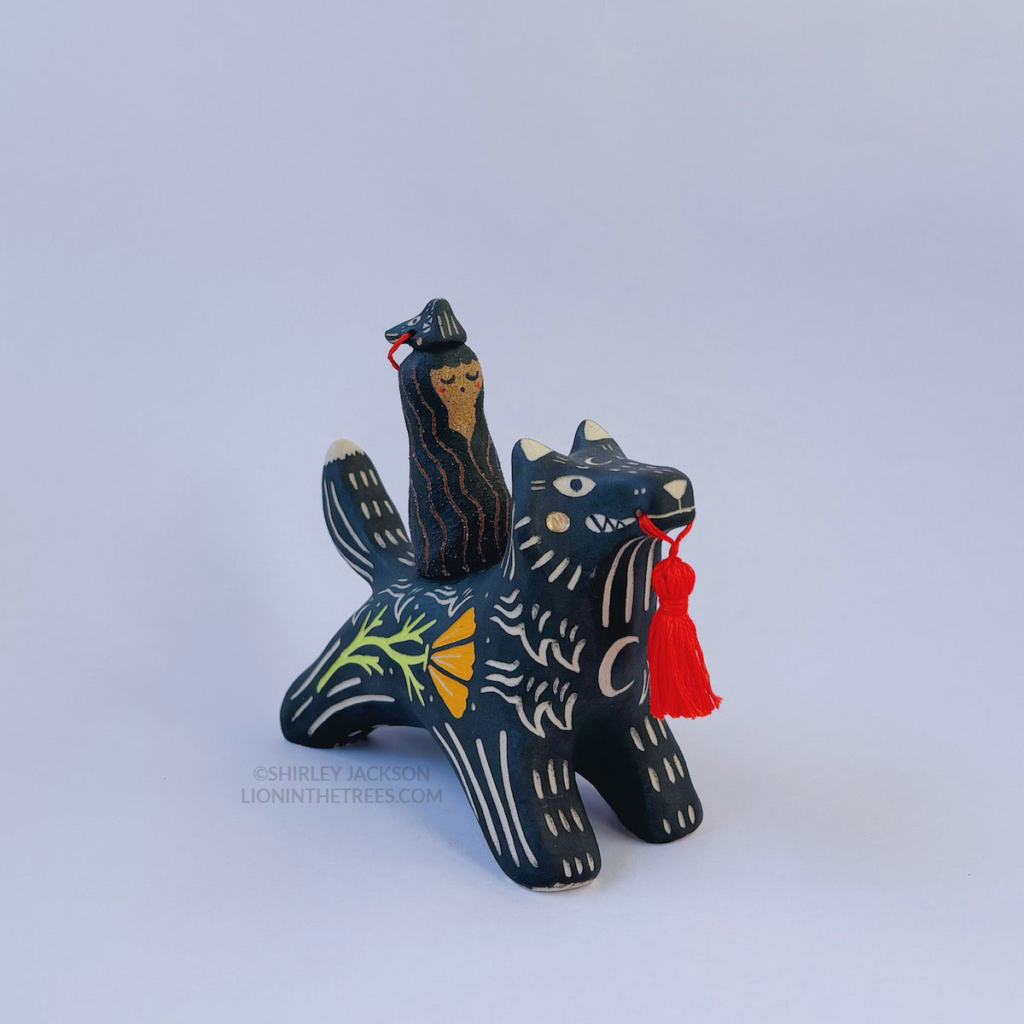 This one was interesting because it's the first time I've tried combining two different clay bodies together, and it turned out beautifully! And I love her little matching wolf mask. 🙂